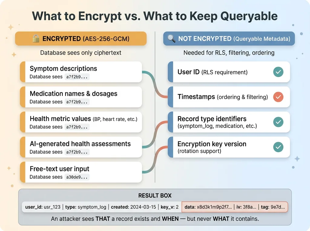 This means someone with raw database access could see: "User X created a health record of type symptom_log at 2024-03-15T09:30:00Z." They could not see what the symptom was, how severe it was, or what the AI assessment said about it.