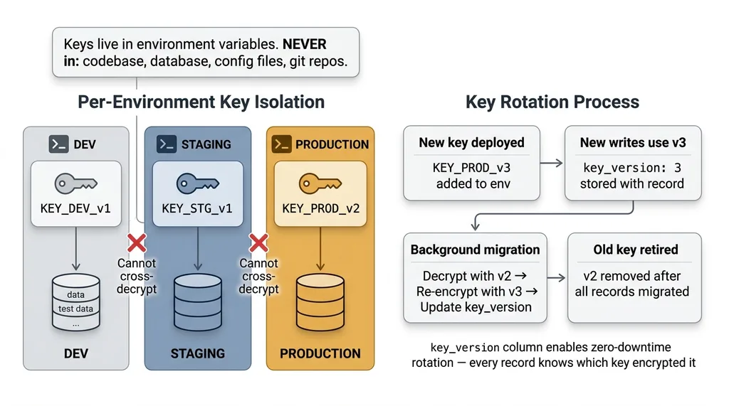 - Per-environment keys. Dev, staging, and production each have their own encryption key. Test data encrypted in dev cannot be decrypted in production, and vice versa.