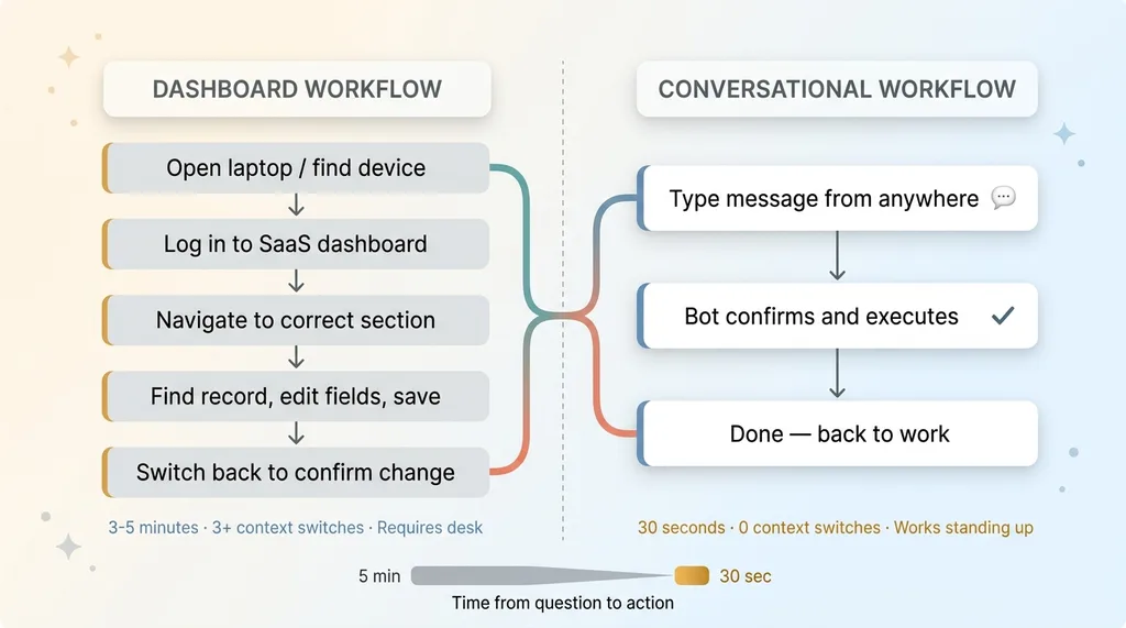 A conversational interface collapses that entire loop. Ask a question, get the answer, take action, receive confirmation — all in one thread, all in 30 seconds. The gap between knowing and doing shrinks to nearly zero.