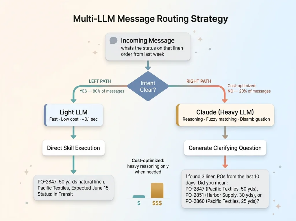 This is where Claude comes in. The heavier reasoning model handles the ambiguous cases — interpreting partial information, matching fuzzy references, generating natural clarification questions. The lighter model handles the clear-cut cases where intent is obvious. This multi-LLM approach keeps costs low for the 80% of messages that are straightforward, while still handling the messy 20% well.