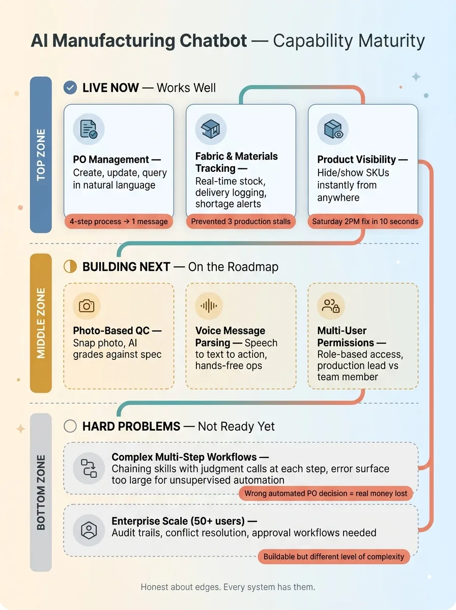 What's harder: Complex multi-step workflows. Something like "reorder fabric for all POs that are running low based on current production velocity" requires chaining multiple skills with judgment calls at each step. How low is "running low"? What's the reorder quantity? Which supplier? The error surface gets large, and a wrong automated decision on a purchase order costs real money. I'm not comfortable letting that run unsupervised yet.