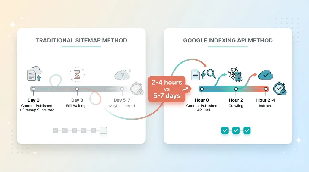 When I submit a URL through the Indexing API, it typically gets indexed within 2-4 hours. Sometimes faster. The difference isn't subtle — it's the difference between traffic today and traffic next week.