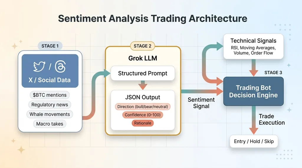 I built an AI trading bot from scratch late last year. Version 0.1 was pure technicals — moving averages, RSI, volume profiles, order flow data. It worked. Not spectacularly, but it was profitable on a small sample. The problem was obvious within weeks: the bot had no idea why something was moving. It could see that Bitcoin was breaking above resistance on volume, but it couldn't see that the breakout was being fueled by a rumor about a spot ETF approval spreading across X in real time. AI sentiment analysis trading was the missing layer. Not as a primary signal — I'm not naive enough to think Twitter vibes replace quantitative analysis — but as a confirmation filter that could tell me whether the narrative matched the price action. Crypto markets move on narrative faster than fundamentals. A single tweet from the right account can move a $2 billion token 8% in minutes. That's not noise. That's data. The hypothesis was simple: if I could score real-time sentiment from X — where crypto narratives break first, before they hit Bloomberg or CoinDesk — I could filter out false signals and catch momentum shifts earlier. I want to be clear upfront. This was an experiment, not a guaranteed alpha generator. I went in expecting modest improvements and a lot of tuning. That's exactly what I got. The tool choice was obvious. xAI's Grok has native access to X data. No other LLM has that. Claude can't see X. GPT can't see X. Gemini can't see X. If you want real-time social sentiment from the platform where crypto lives, Grok is the only model that doesn't require you to build and maintain a separate scraping pipeline.