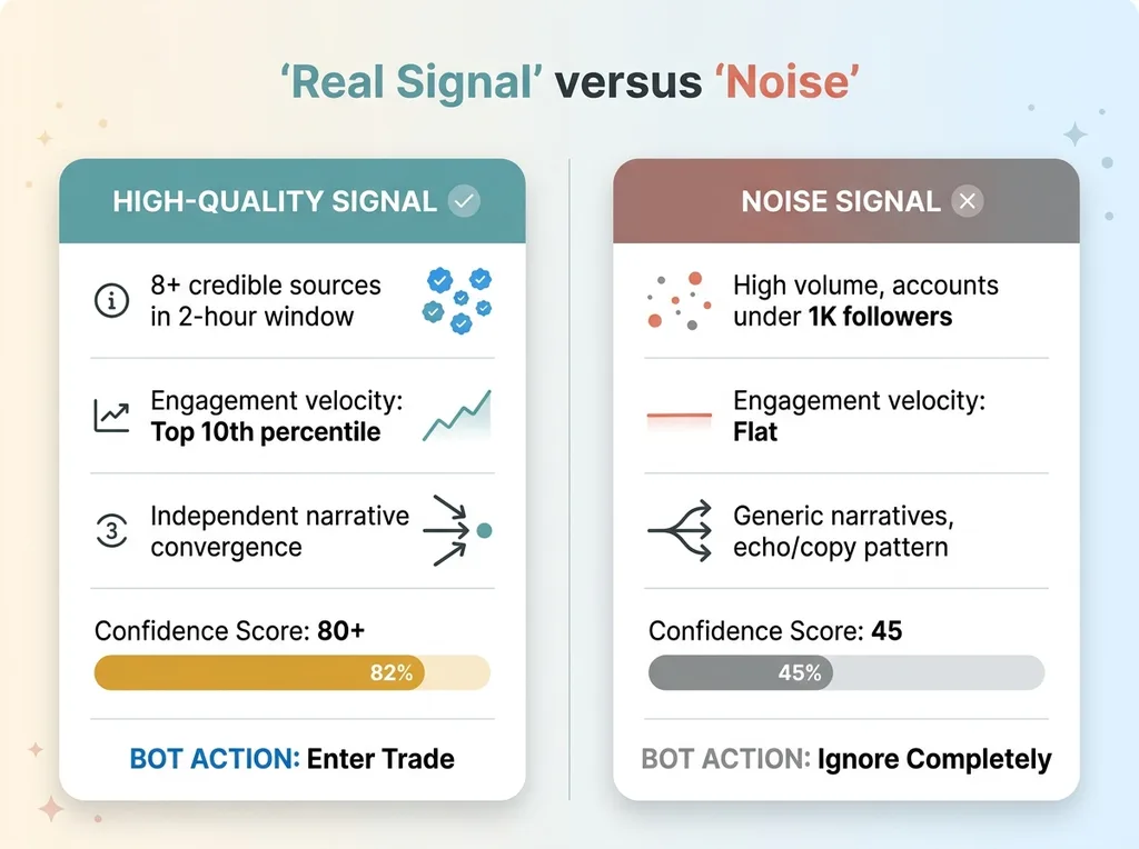 A noise signal looks like this: high volume of positive mentions but all from accounts under 1,000 followers, engagement velocity flat, narratives are generic ("BTC to 100k!"), confidence score 45. The bot ignores this completely.