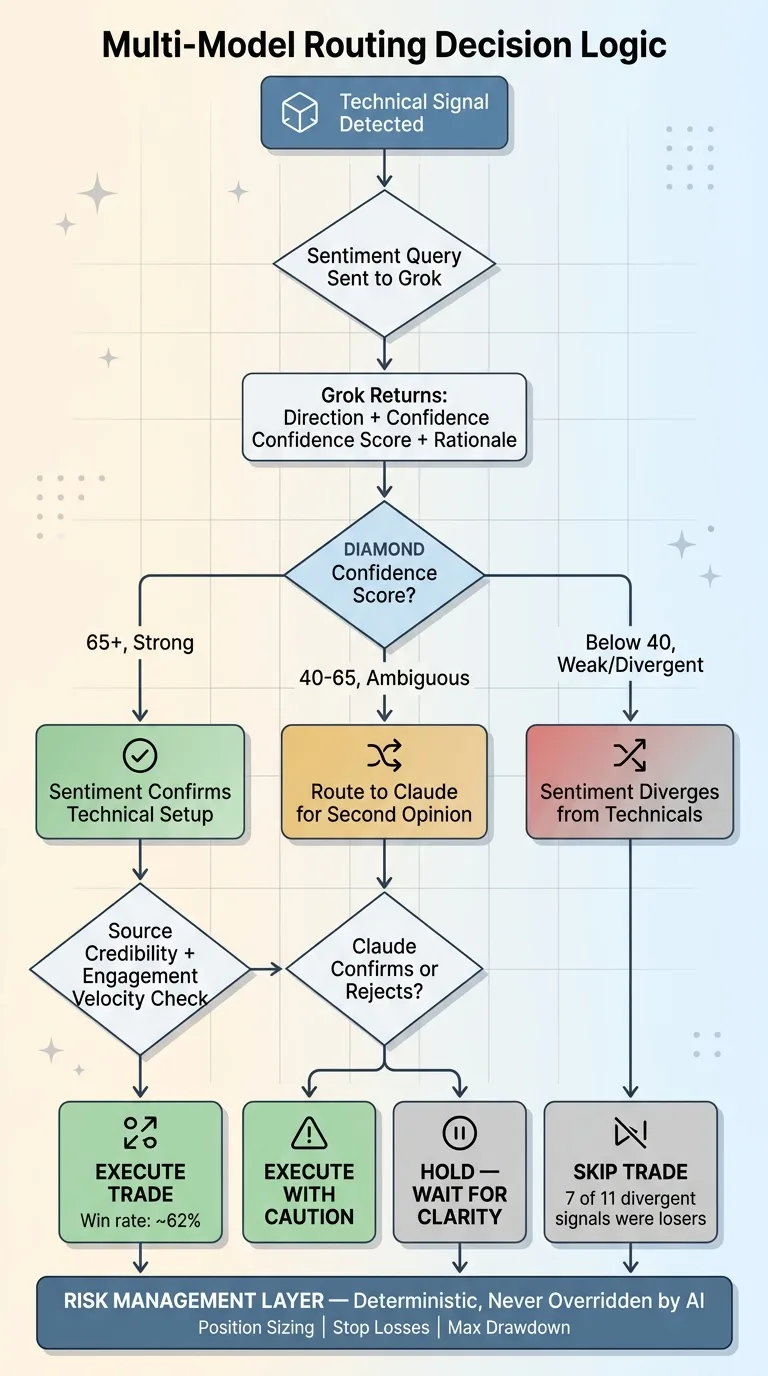 In production, 90% of sentiment queries go to Grok only. About 10% get routed to Claude for additional analysis. The routing logic is simple: if Grok's confidence is between 40-65 (the ambiguous zone) or if the query involves regulatory or macro themes, escalate to Claude.