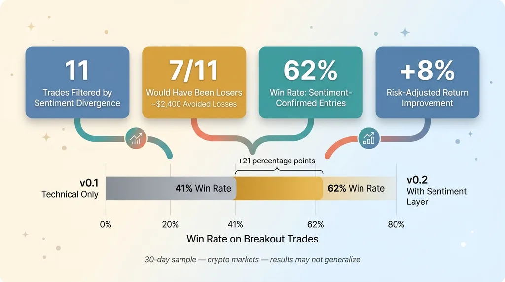 Over 30 days, the bot flagged 11 potential entries where technicals looked good but sentiment diverged. I tracked what would have happened. Seven of those 11 would have been losers — either stopping out or fading back below the breakout level within hours. That's 7 avoided losses on trades the technical-only bot would have taken.
