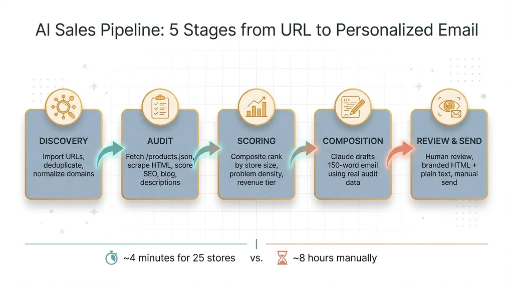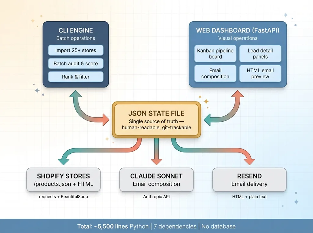 I built a prospecting engine that audits Shopify stores, scores leads, and writes personalized cold emails — all backed by real data. Here's exactly how.