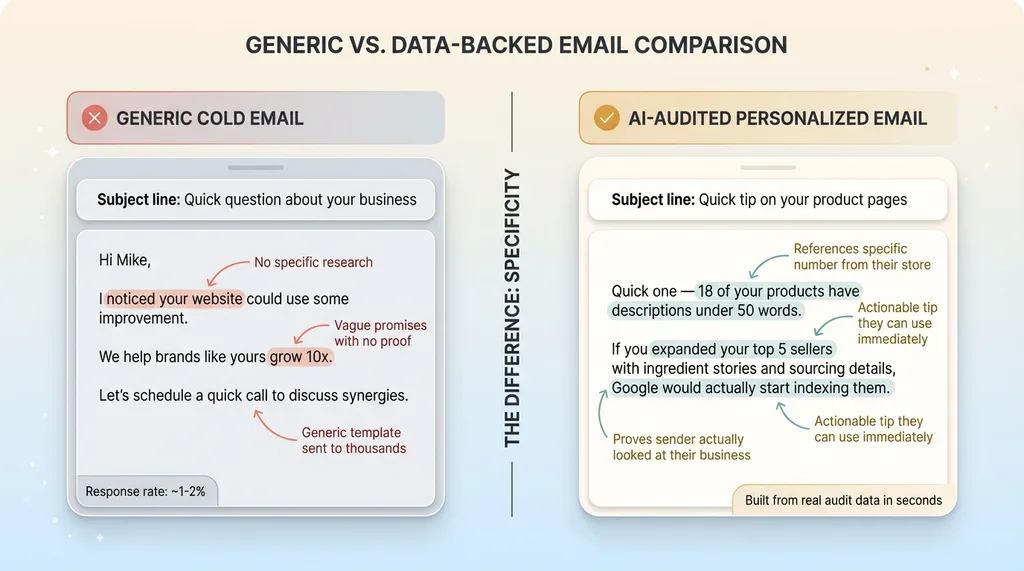 AI changes that equation. Not by writing better generic emails — by doing the research at scale and writing emails that reference real findings. The prospect can tell the difference between "I noticed your website" and "your blog hasn't posted since October and your top products are invisible to Google."