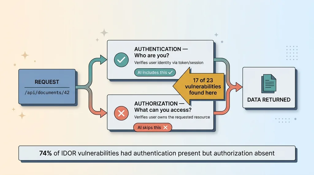 I saw this exact pattern — authentication present, authorization absent — in 17 of the 23 IDOR vulnerabilities I found. The AI was smart enough to include auth middleware. It just wasn't trained to think about what comes after authentication.
