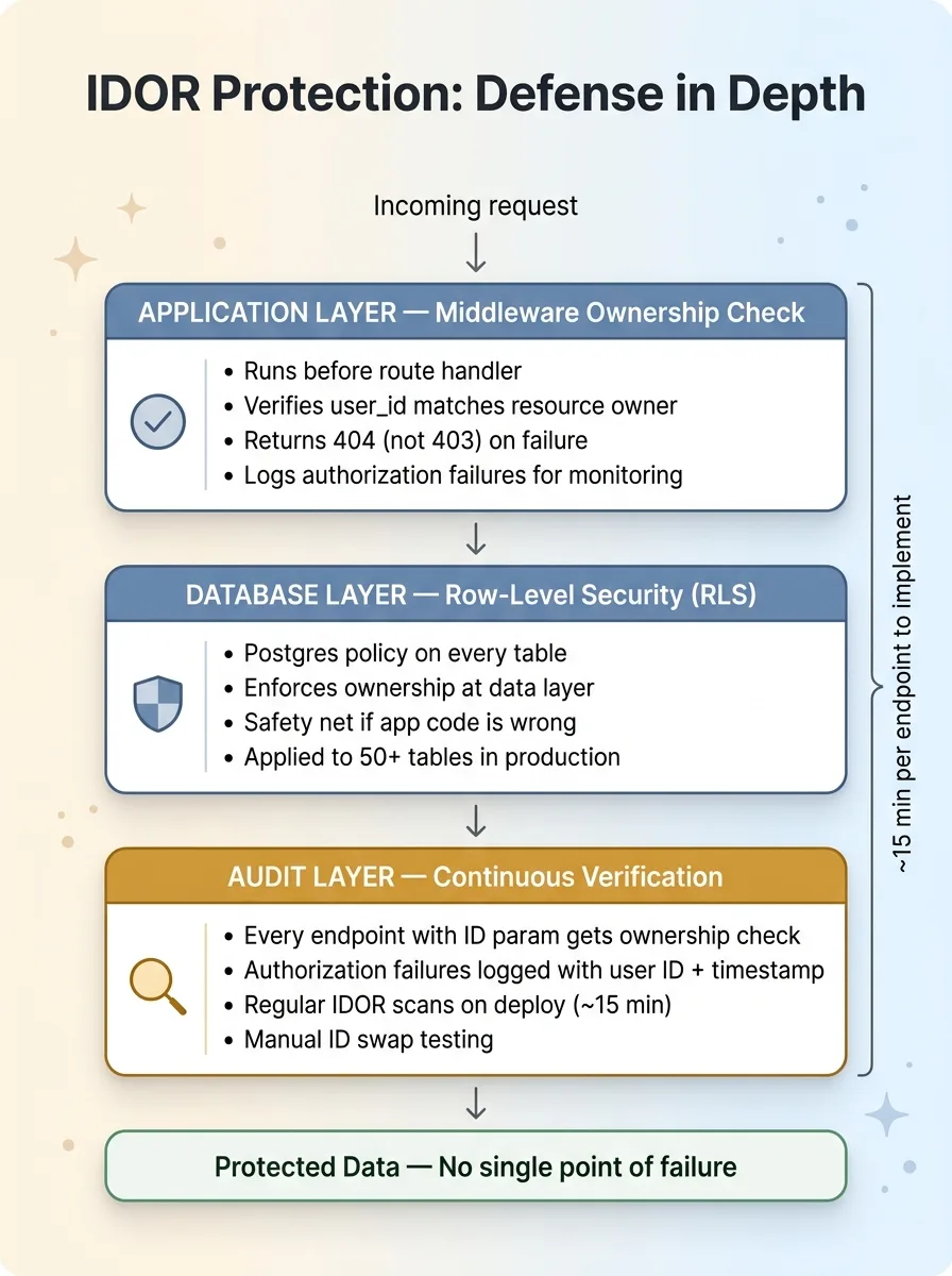 IDOR protection is the most critical access control fix most AI-generated codebases are missing, but it's one layer in a stack that needs several.