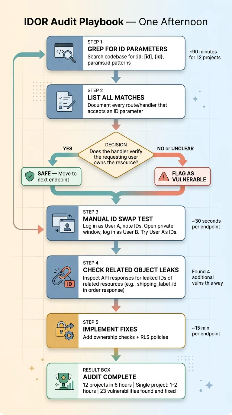 My 12-project audit took about 6 hours total. A single project with 20-30 endpoints takes 1-2 hours. You can do this on a Saturday morning. Given what's at stake, you should.