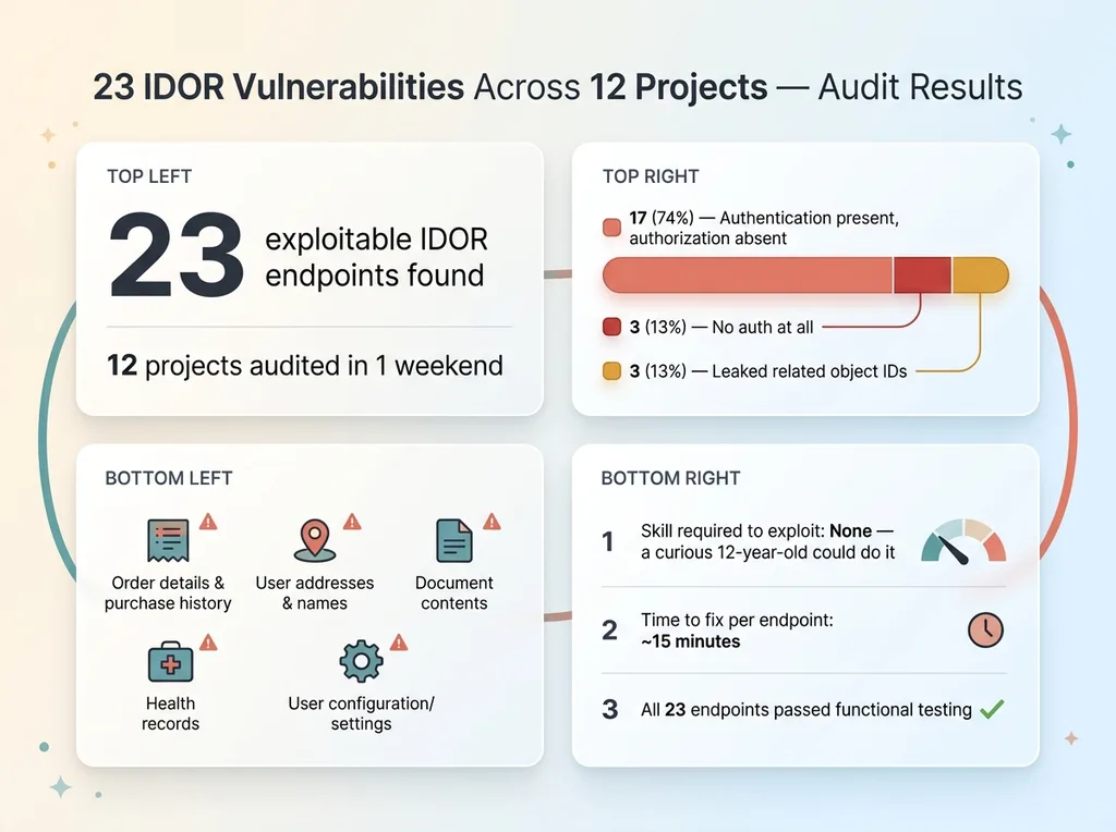 I found 23 IDOR vulnerabilities across 12 projects in one weekend. Not theoretical risks on a slide deck. Not hypothetical attack vectors from a security whitepaper. Real, exploitable endpoints in production and near-production code where any authenticated user could access another user's data by changing a number in the URL.