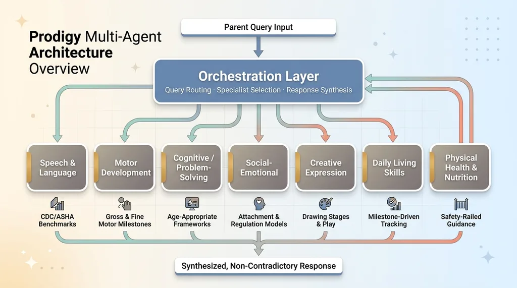 I named the architecture internally "Prodigy" — partly tongue-in-cheek, partly aspirational. The core idea: seven specialist agents, each with deep domain expertise, coordinated by an orchestration layer that routes queries and synthesizes responses.