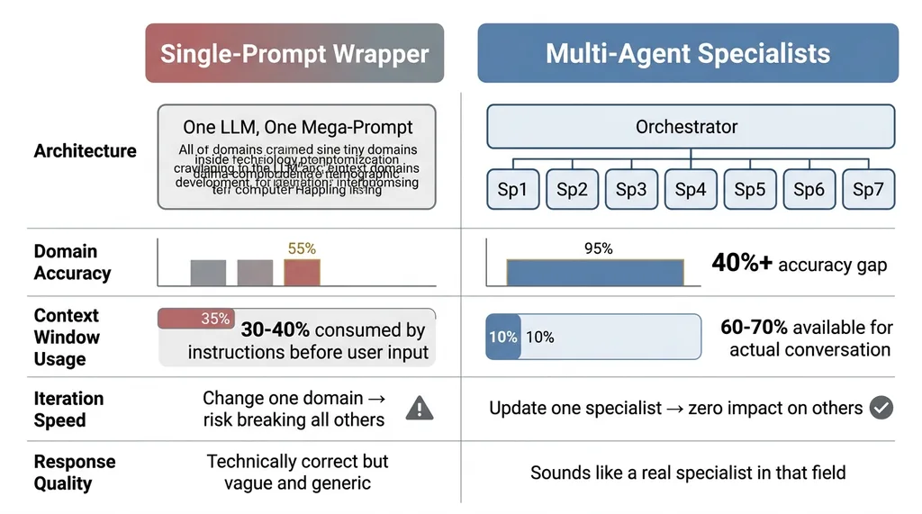 When you stuff one system prompt with instructions for seven domains, the model's attention gets spread thin. I ran a controlled comparison: same 50 parent queries, one set answered by the single mega-prompt approach, one set answered by the specialist architecture. A developmental pediatrician consultant scored both sets against a rubric covering accuracy, specificity, age-appropriateness, and actionability.