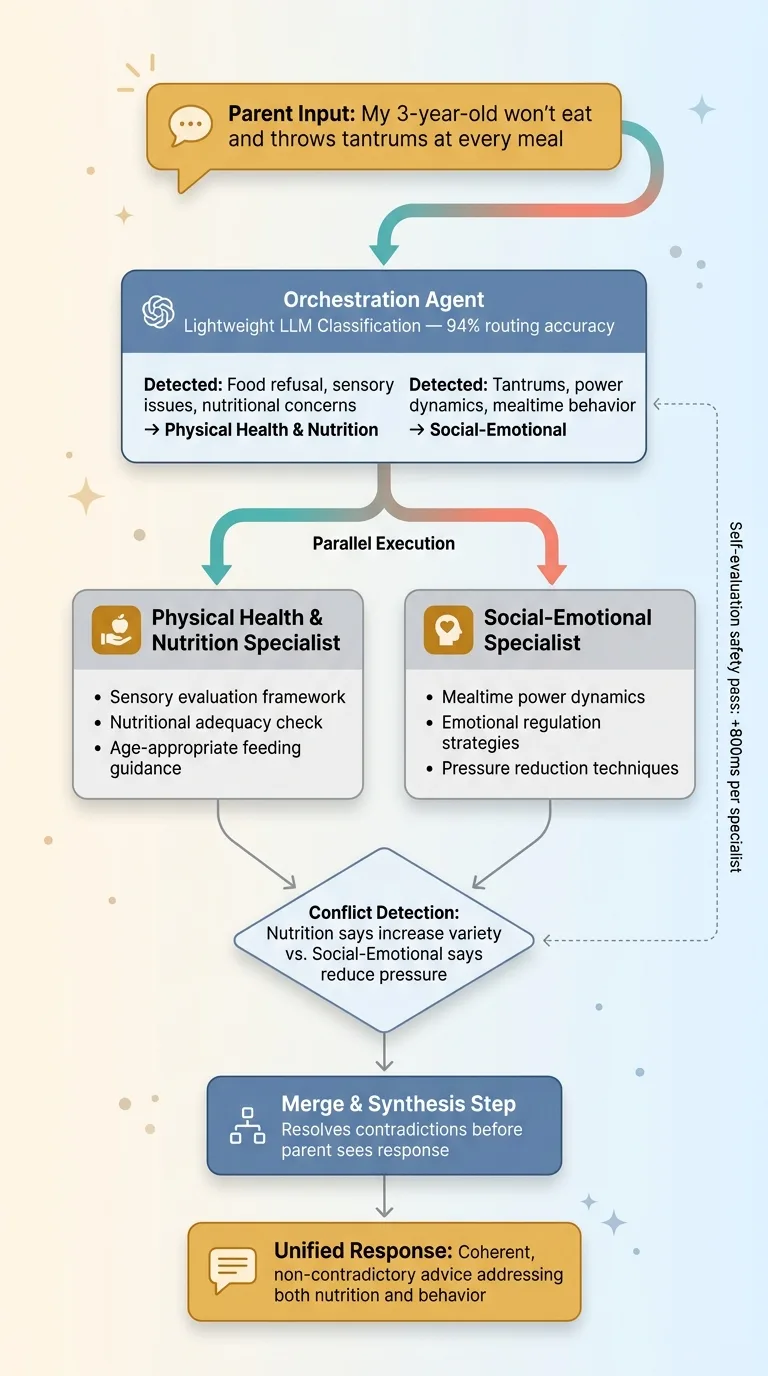 The merge step is critical. Without it, you get two separate answers that might conflict — the nutrition specialist pushing more food variety while the social-emotional specialist recommends reducing mealtime pressure. The orchestrator resolves these tensions before the parent ever sees the response.