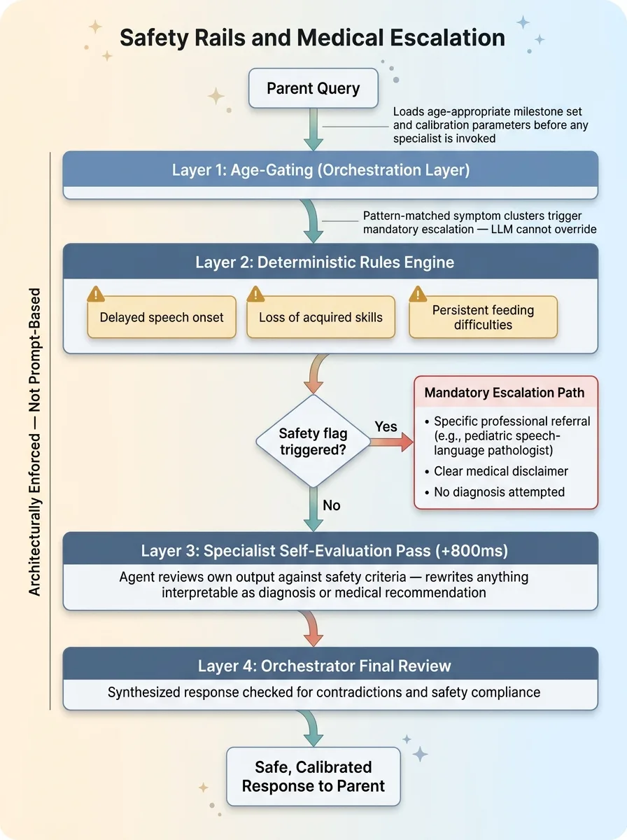 Every specialist has hard-coded safety rails. If a parent describes symptoms that could indicate a developmental disorder — delayed speech onset, loss of previously acquired skills, persistent feeding difficulties beyond normal toddler pickiness — the agent doesn't diagnose. It flags. It provides a clear, specific disclaimer. It recommends the exact type of professional to consult (not just "talk to your doctor" but "request an evaluation from a pediatric speech-language pathologist").