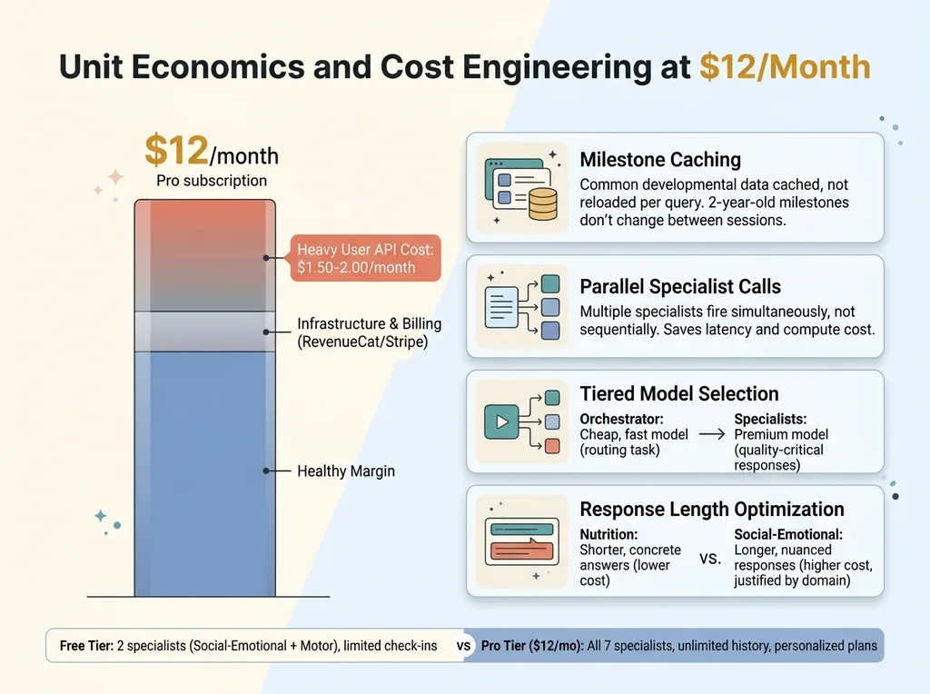 Multi-agent calls cost more than single calls. That's the tradeoff. A typical query might hit 1-3 specialists plus the orchestrator. At scale, a heavy Pro user — someone checking in daily, asking detailed questions — might cost $1.50-2.00/month in API calls.