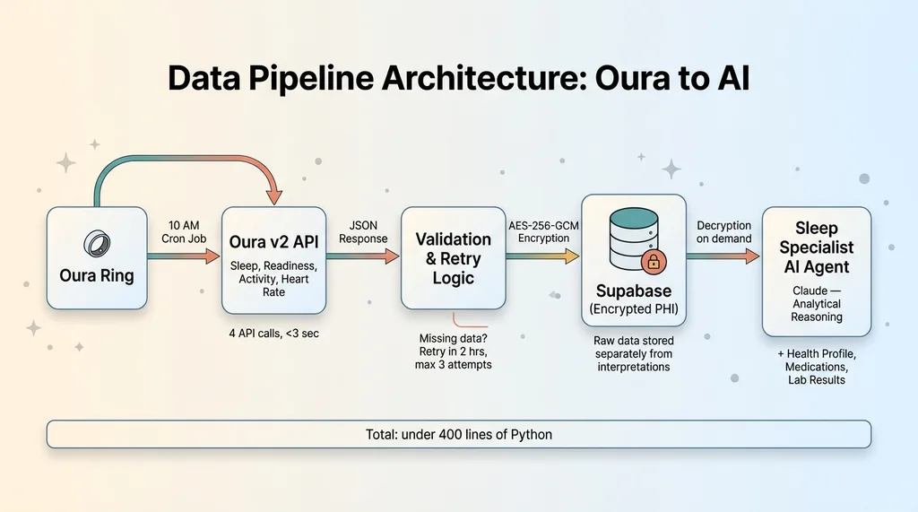 A Python script runs on a scheduled cron at 10 AM Pacific. It pulls the last 24 hours of sleep, readiness, and activity data from the Oura API. The script validates the response — confirms the expected date's data is present, checks for null fields that would indicate a partial sync — and either writes to the database or schedules a retry.