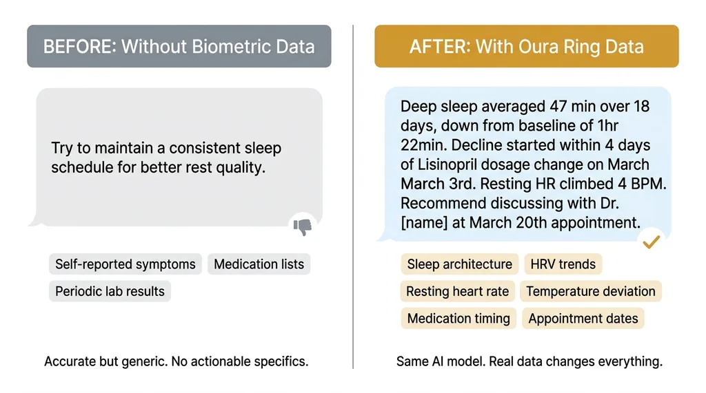 Before the Oura Ring API integration, the AI health team worked with self-reported symptoms, medication lists, and lab results uploaded after doctor visits. The advice was accurate but generic. "Aim for 7-8 hours of sleep." "Stay hydrated." "Report any new symptoms to your doctor." All true. All useless.