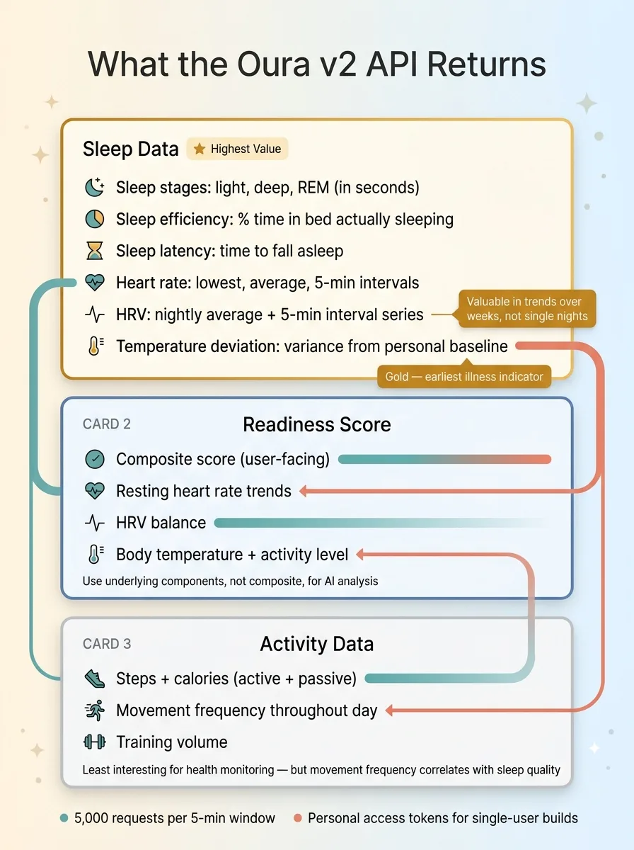 Before you build anything, you need to know what the Oura v2 API actually returns. I went in expecting limited data. I was wrong. It's one of the cleaner wearable APIs I've worked with — well-documented JSON responses with genuinely useful granularity.