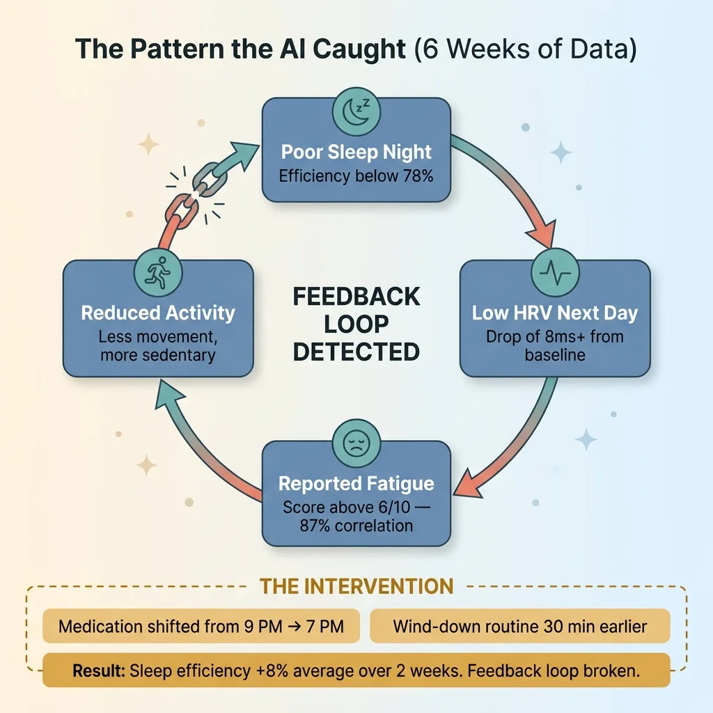 The recommendation was specific and modest: shift her evening medication from 9 PM to 7 PM (based on research about that drug's half-life and sleep architecture impact), and start her wind-down routine 30 minutes earlier. She made both changes. Over the next two weeks, sleep efficiency improved by 8% on average, and the low-HRV-to-fatigue chain broke.