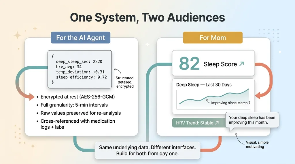 I'd also add trend visualization sooner. I built a data pipeline, but my mom doesn't care about the AI's reasoning chain. She wants to see a graph showing her deep sleep improving over the past month. The dashboard needs to serve two audiences: the AI (structured data, encrypted, detailed) and the human (visual trends, simple, motivating). I built for the AI first. I should have built for both simultaneously.