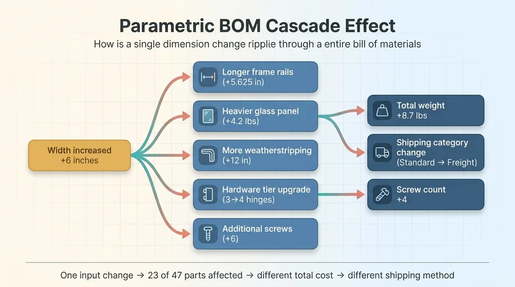 This isn't just a spreadsheet formula. The sizing rules have conditional logic, edge cases, and interdependencies. When one dimension changes, it can cascade through dozens of parts. A wider window needs longer rails, which means heavier glass, which triggers a different hardware tier, which changes the screw count, which affects the total weight, which might push the product into a different shipping category. That cascade is what makes spreadsheets break down and what makes a parametric BOM calculator essential.