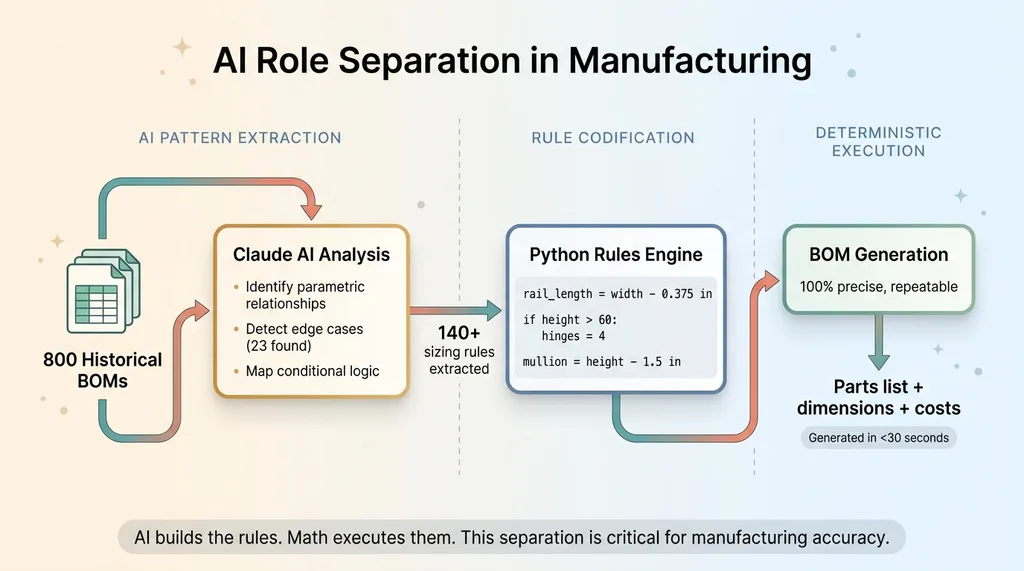But AI is invaluable in building the rules in the first place. This client had approximately 800 past orders in spreadsheets. Each one was a manually calculated BOM with all the part dimensions spelled out. That's training data.