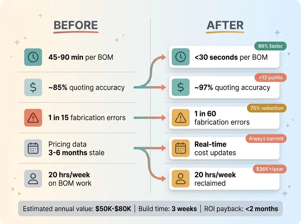 Before: 45-90 minutes per BOM. 15-20 BOMs per week. Stale pricing data. Fabrication errors requiring rework at ~$200 per incident. One person spending roughly 20 hours per week on BOM-related work.