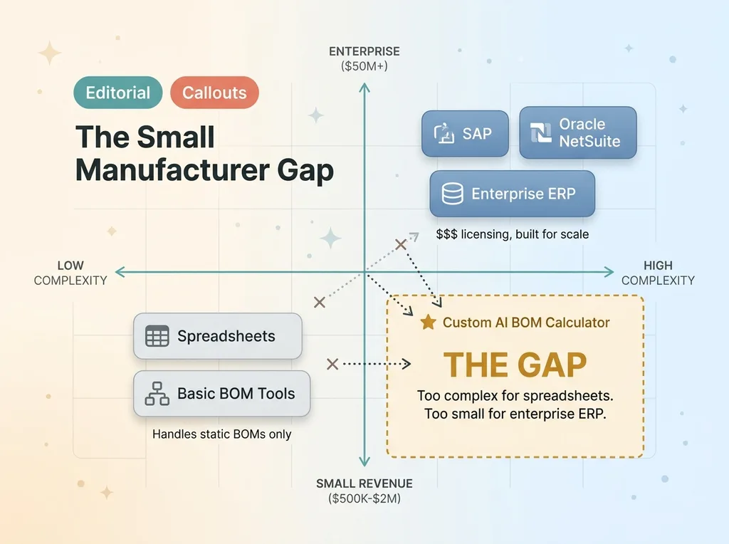 This is the gap nobody talks about. Small custom manufacturers are too complex for spreadsheets and too small for enterprise ERP. They fall right through the middle.
