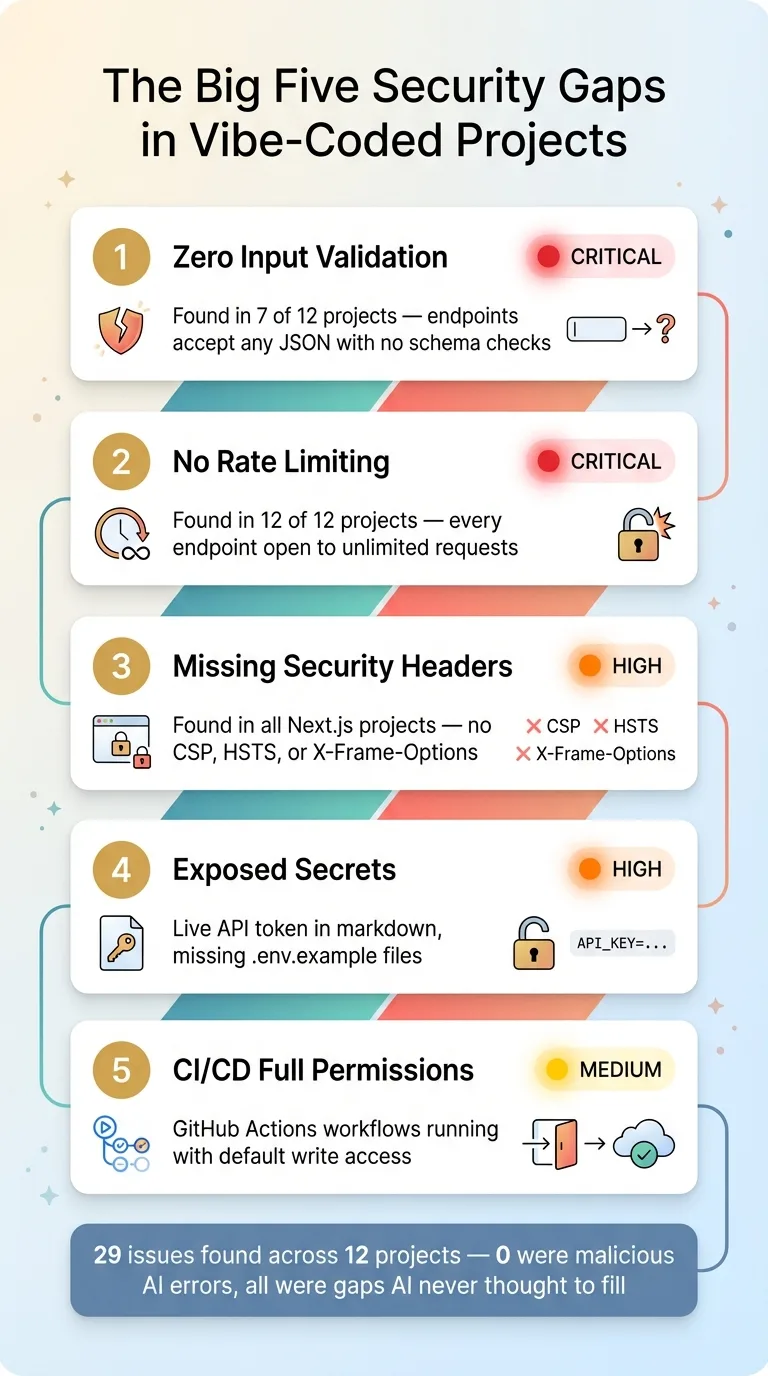 These aren't exotic attack vectors. They're baseline security hygiene that every production app needs. Vibe coding skips them almost every time — not because the coder is careless, but because the feedback loop doesn't surface them.