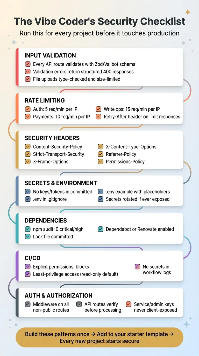 The good news: once you build these patterns once, they're reusable. A validation utility, a rate limiter, a security headers config — these become part of your starter template. Every new project starts secure from line one.