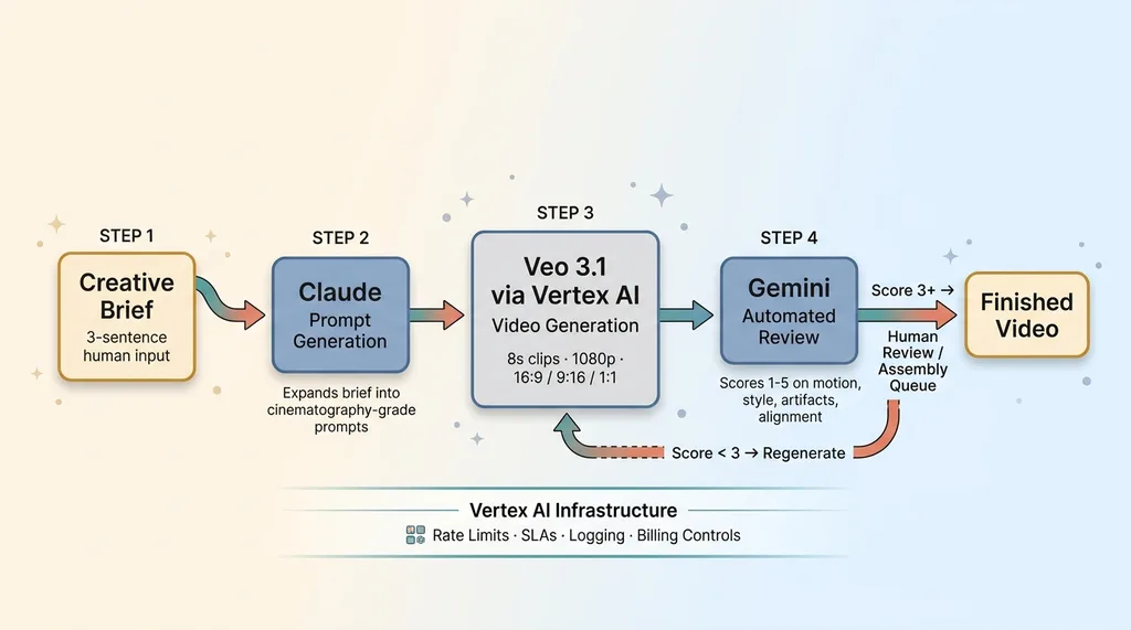 The pipeline uses three models doing different jobs. Claude writes the video prompts based on a creative brief. Veo 3.1 generates the clips via Vertex AI. Gemini reviews the output against a scoring rubric.