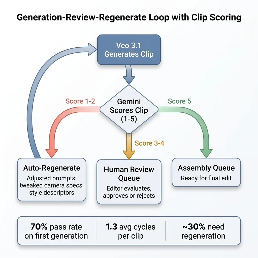 Every generated clip runs through an AI video review system using Gemini. Gemini scores each clip on motion quality, style adherence, visual artifacts, and brief alignment on a 1-5 scale. Clips scoring below 3 get automatically regenerated with adjusted prompts — the system tweaks camera specifications or style descriptors based on what Gemini flagged. Clips scoring 3-4 get queued for human review. Clips scoring 5 go straight to the assembly queue.