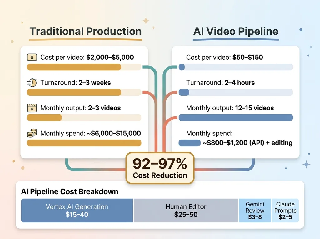 Vertex AI at scale. If you're producing 100+ videos per month, the API costs are not trivial. For this client, we're running roughly $800-$1,200 per month in API costs across all three models. Still vastly cheaper than a production company, but not the "practically free" story some people sell.