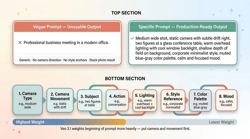 Order matters. Veo 3.1 weights the beginning of the prompt more heavily than the end. Put your camera and movement first, because those are the hardest elements for the model to get right on revision.