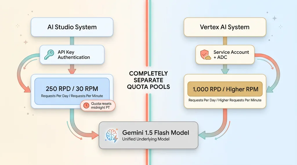 This is the critical one. AI Studio and Vertex AI maintain entirely separate quota pools, even for identical models.