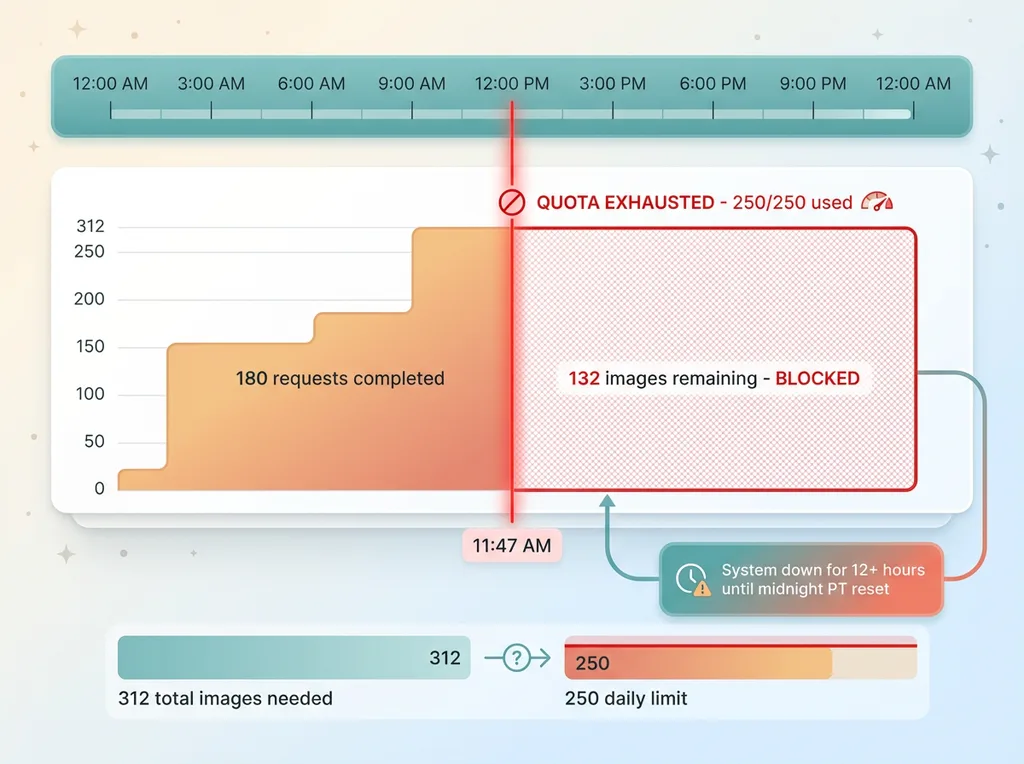 Our blog visual generation pipeline processes 312 images in a batch. That's 312 API requests if you're generating one image per call. At 250 RPD, we can't complete a single batch in one day.