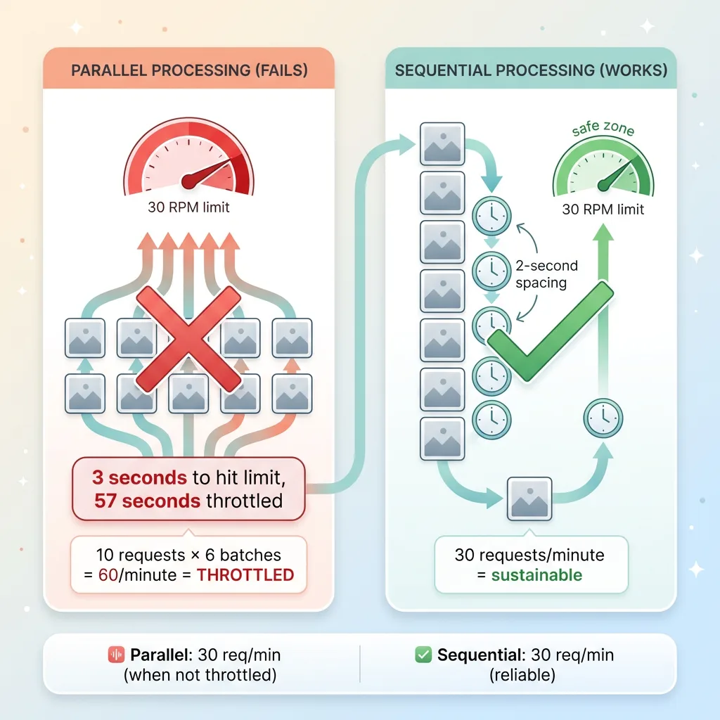 My initial pipeline implementation used parallel requests. Generate 10 images simultaneously, move to the next batch of 10, repeat. Fast in theory.