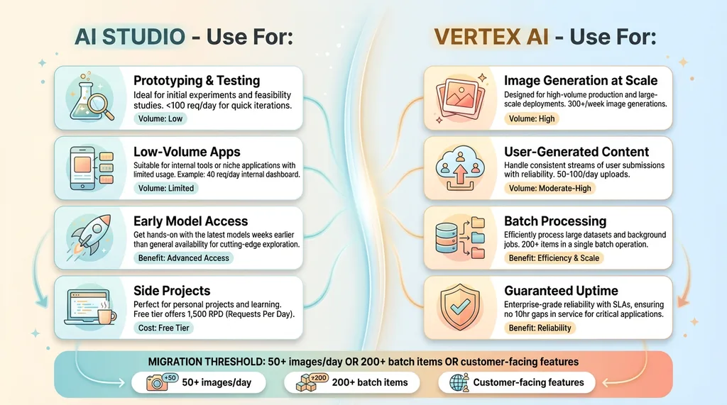 The specific numbers that matter: if you're generating 50+ images per day, Vertex AI makes sense. If you're running a chatbot with 200+ daily users, same answer. If you're processing any batch job over 200 items, you need Vertex AI's higher quotas.
