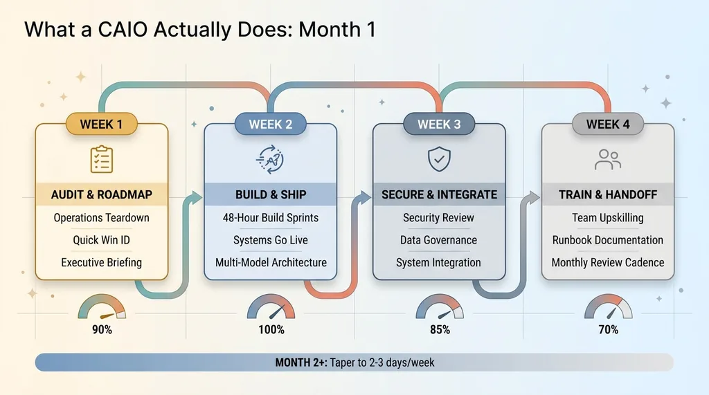 So here's what a typical first month looks like, week by week, when you bring on a CAIO. Not a pitch deck version. The actual work.