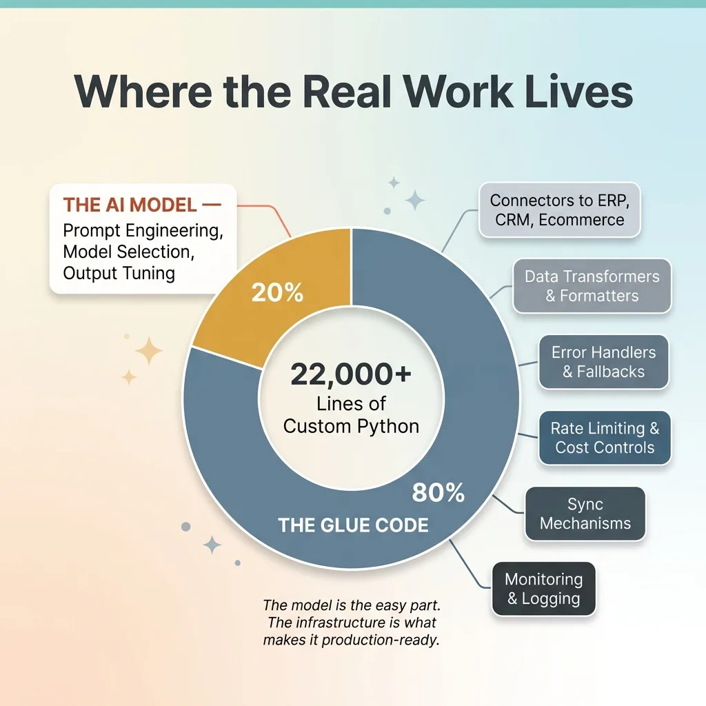 This is where my 22,000+ lines of custom Python come from. Not from fancy algorithms — from the connectors, data transformers, error handlers, and sync mechanisms that make AI systems reliable in production. It's not glamorous. It's the difference between a demo and a deployed system.