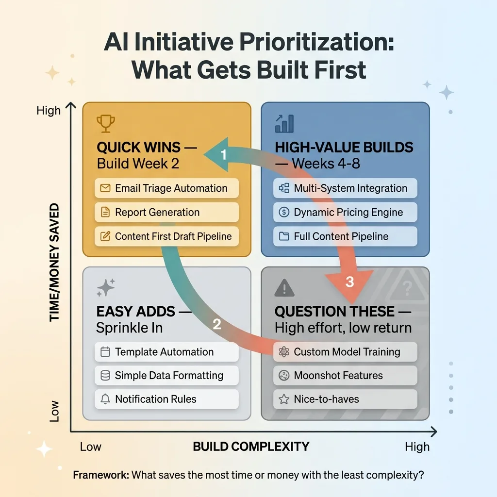 I identify 2-3 quick wins that can ship the following week. These are usually things like automated email triage for a team drowning in 150+ messages a day, a report that currently takes someone 4 hours to build manually, or a basic content system that eliminates the blank-page problem for marketing. The quick wins serve a dual purpose — they deliver immediate value, and they build internal confidence that this approach actually works.