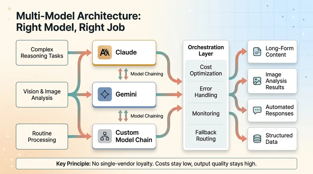 This is also where multi-model architecture decisions happen. I'm not loyal to any single AI vendor. Claude handles complex reasoning and long-form content. Gemini handles vision tasks and image analysis. Custom model chaining keeps costs down while maximizing output quality. The right model for the right job, every time.